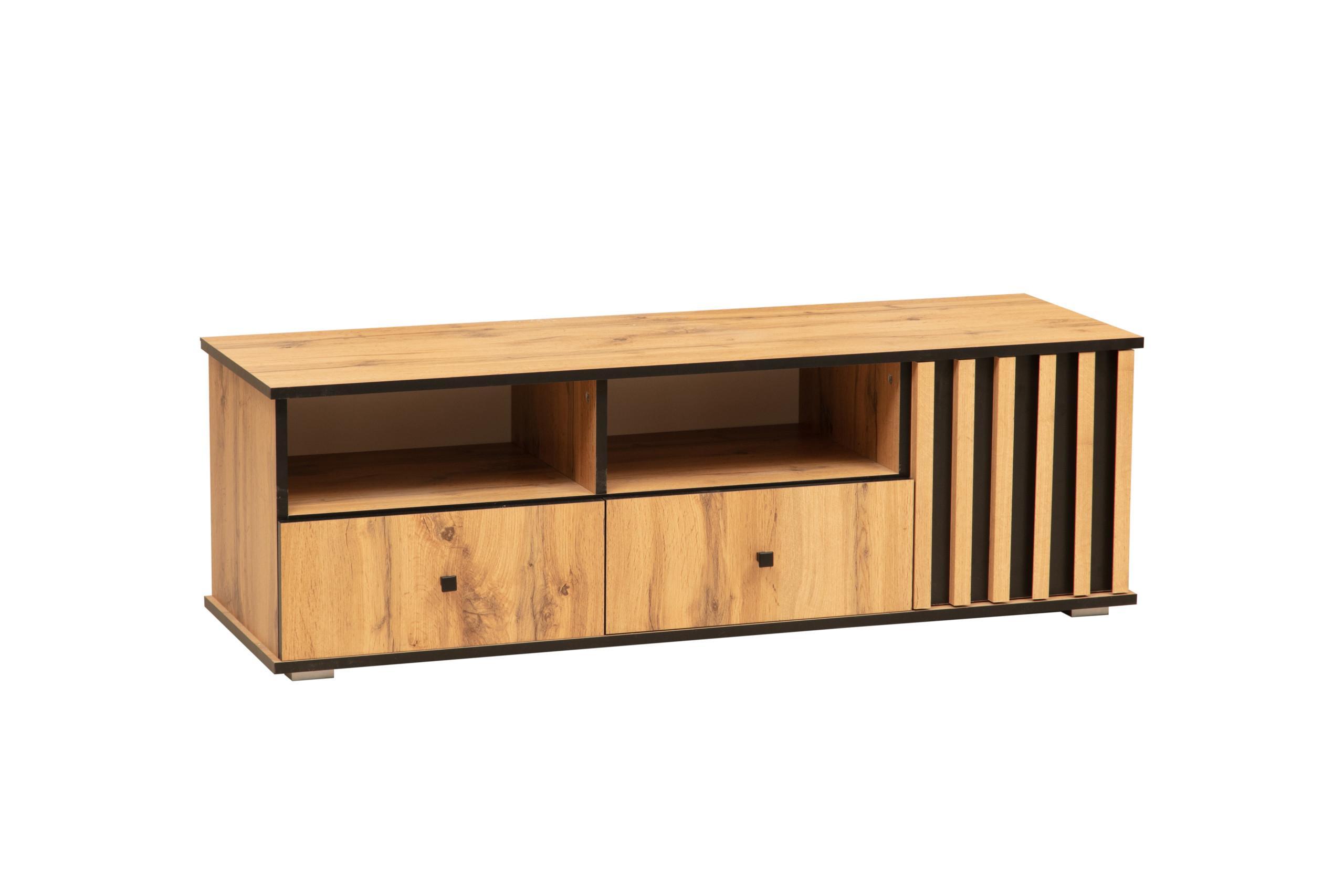 Тумба под ТВ 51.06 Либерти (опора h=20мм) (дуб вотан / черный / профиль: Masa Decor дуб вотан) исполняется в классическом стиле и спокойных цветах. Модель сочетает в себе простоту и функциональность, но при этом не выглядит громоздко. Она гармонично впишется в пространство, не утяжеляя его.